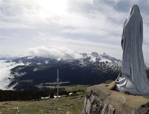 Le sommet, flanqué d'une vierge et d'une croix de fer offre une impressionnante vue plongeante sur la vallée. De l'autre côté, le plateau semble calme vu d'en haut. Au loin, les Rochers de Leschaux et la Chaîne du Bargy dans son intégralité laissent apercevoir les Aravis et le Mont Blanc.