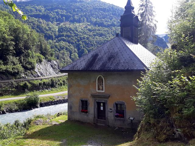 Itinéraire : traverser le pont et remonter le large chemin rive gauche jusqu'à la Chapelle des Fays-Sougey. Ce joli édifice adossé au rocher surplombe le Giffre depuis 1675.